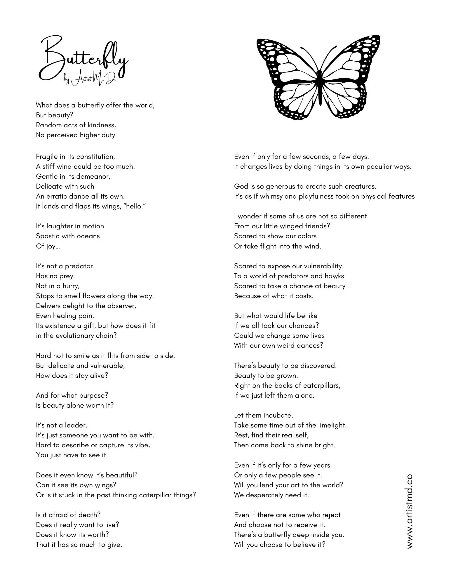 Butterfly is a poem by Artist M.D. capturing the concept that we each hold beauty if we’ll be brave enough to show it.